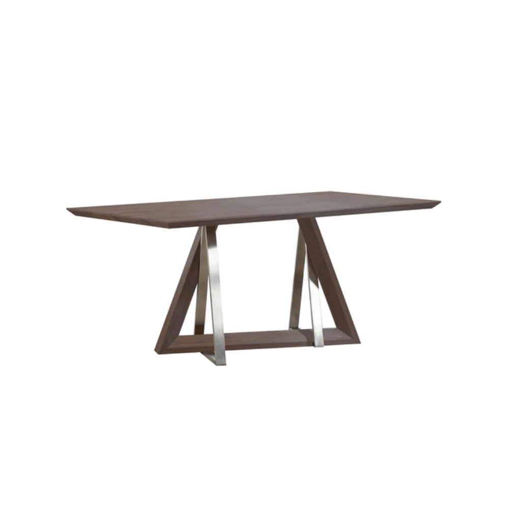 Elevate your dining experience with the Drake Dining Table by !nspire — a bold fusion of geometric design and rich, contemporary texture. Featuring a walnut-finished reverse bevel tabletop and a striking triangular base with brushed stainless steel accents, this table is the perfect balance of warm wood tones and cool modern metal.