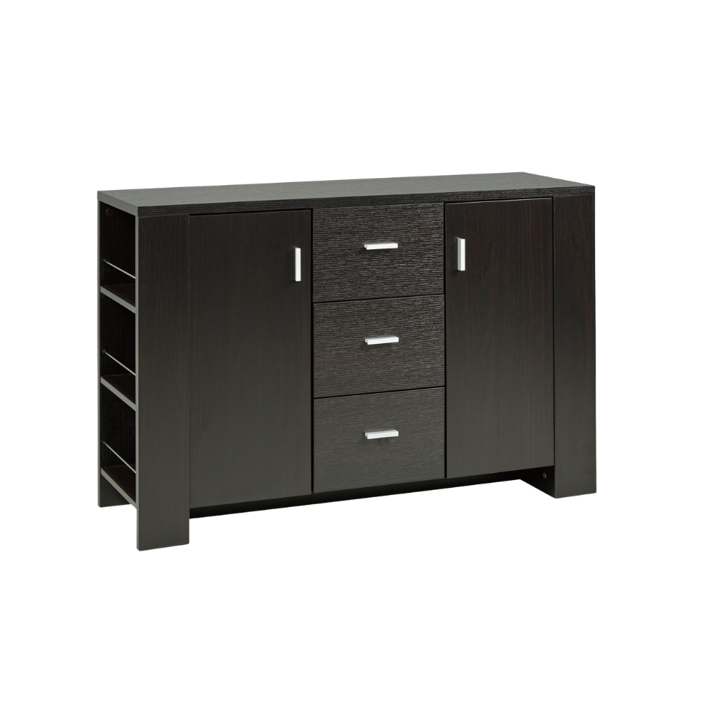 Bring function and style to your space with this sleek dark cherry buffet/server. Featuring four central drawers with textured detailing and two spacious cabinets, this piece offers versatile storage for dining essentials, barware, or living room accessories. Open shelving on the side adds extra space for display or quick-access items.