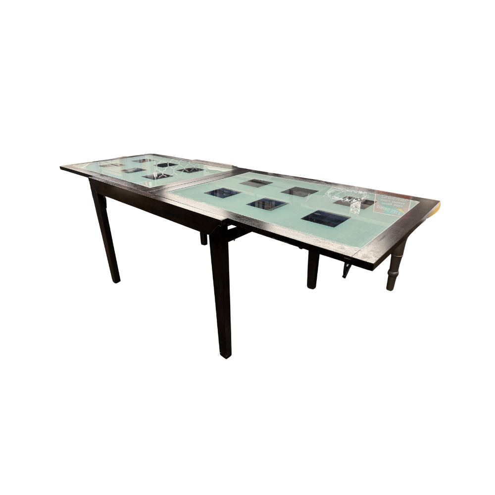 - Glass inset tabletop with modern square accents